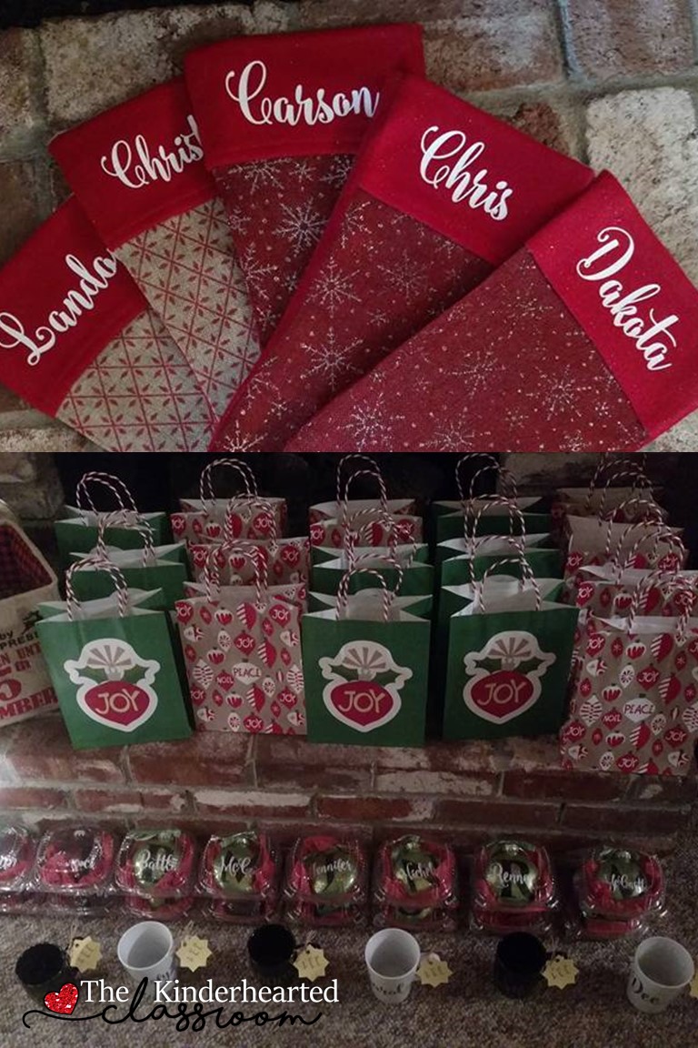 Create Christmas stockings to help decorate your classroom for your students. I also found stockings at the dollar store, used a heat transfer vinyl, cut the vinyl with my Cricut, and then ironed them on. These cost me a whopping $2.00 after everything was done! What a cheap keepsake!